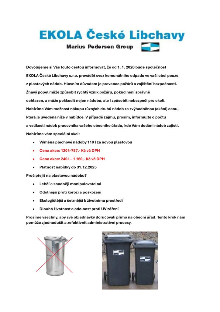 Společnost Ekola, České Libchavy stále přijímá objednávky na plastové popelnice. Objednat je možné na obecním úřadě nebo přímo od společnosti Ekola. Případně je možné použít jakoukoliv běžnou PLASTOVOU popelnici, dle uvážení majitele.