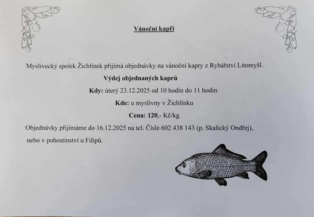 - Výdej objednaných kaprů v úterý 23. 12. 2025 od 10:00 do 11:00 u myslivny v Žichlínku