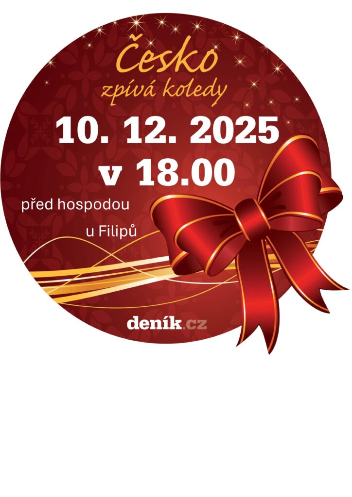Už 15 ročník celorepublikové oblíbené akce Česko zpívá koledy. Ve středu 10. prosince v 18:00 před hostincem U Filipů. Dobrou náladu a silné hlasivky s sebou.
