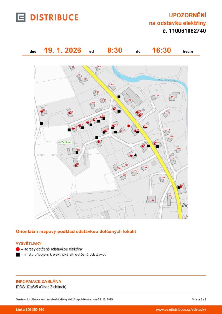 Upozorňujeme občany na odstávku elektřiny v pondělí 19. 1. 2026 od 8:30 do 16:30. Odstávka se týká lokality viz přiložená mapka.