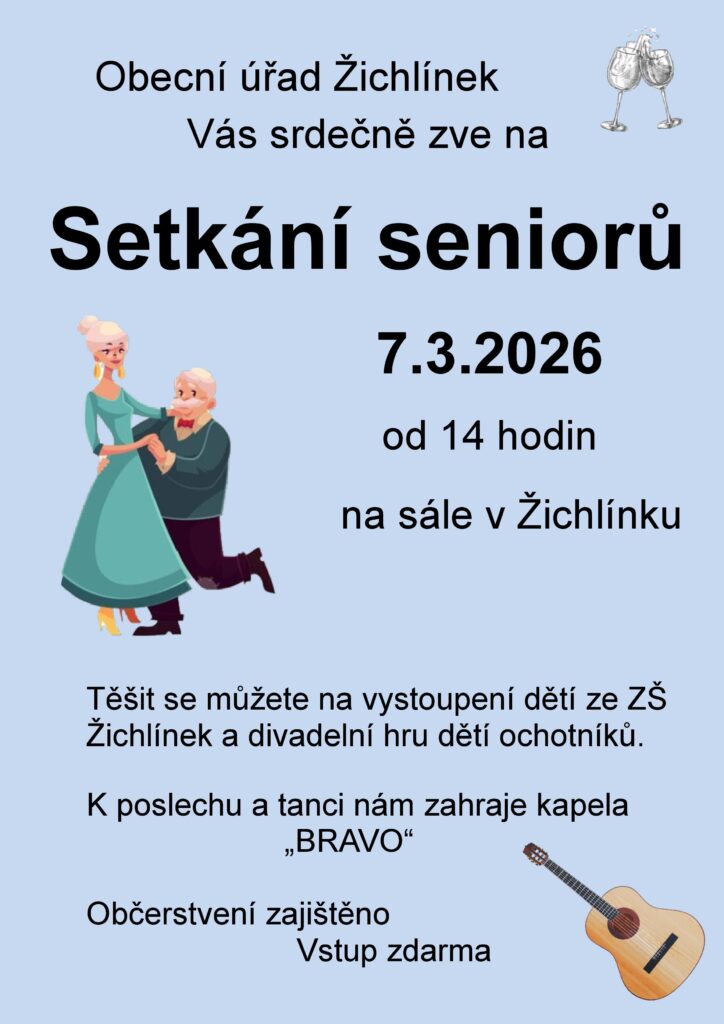 Obecní úřad Žichlínek Vás srdečně zve na Setkání seniorů v sobotu 7. března 2026 od 14:00.