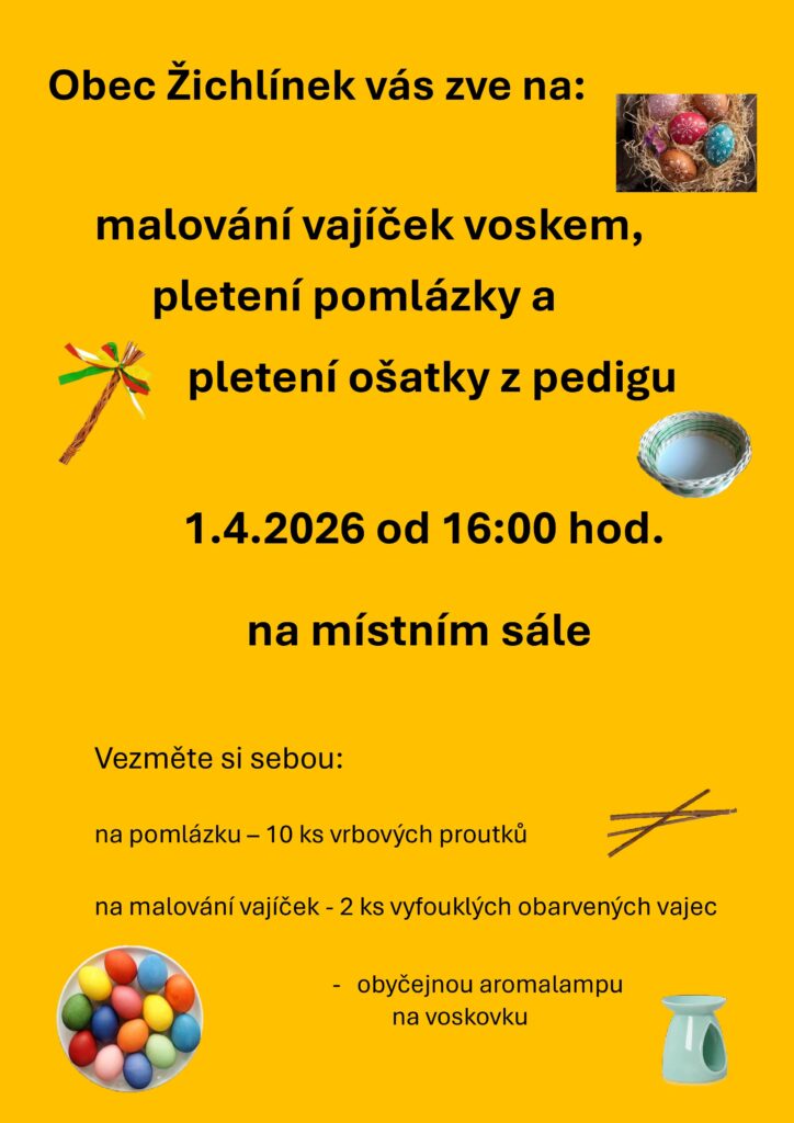 Obec Žichlínek Vás srdečně zve na Velikonoční tvoření. Ve středu 1. dubna 2026 od 16:00 na místním sále. Malování vajíček, pletení pomlázky a pletení ošatek z pedigu.