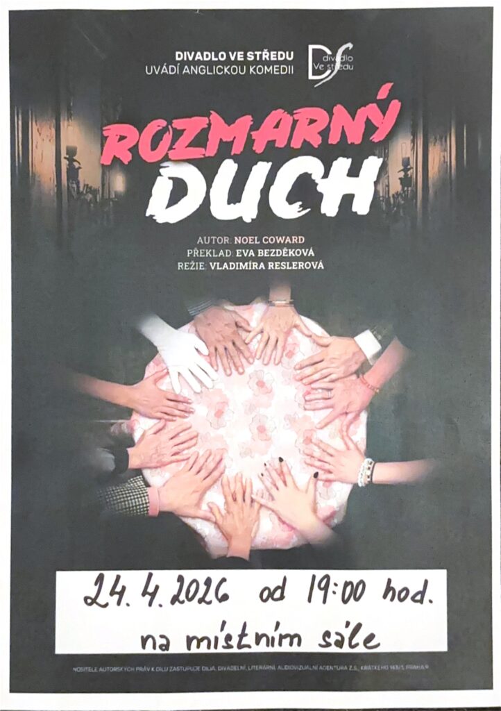 Obec Žichlínek a divadlo Ve Středu Vás srdečně zvou na anglickou divadelní komedii Rozmarný duch. V pátek 24. dubna od 19:00 na místním sále v Žichlínku.